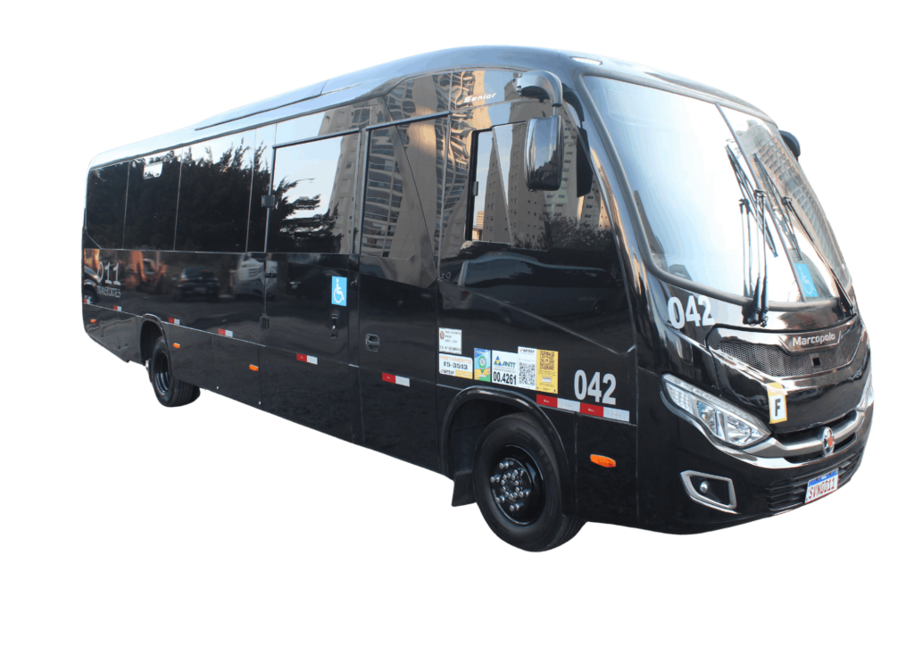 Micro-ônibus com poltronas reclináveis, acabamento em couro ou tecido, ideal para empresas e eventos corporativos.